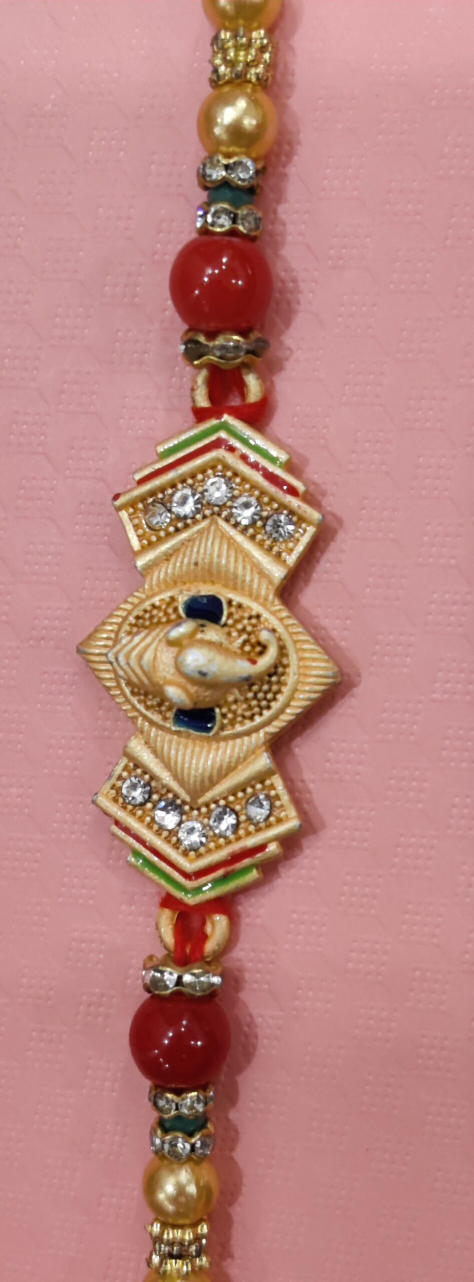 ENRICH YOUR BROTHER’S ARM WITH THIS BEAUTIFUL RAKHI ON THE OCASSION OF RAKHSABHANDAN. IT HAS BEEN HAND CRAFTED WITH BEAUTIFUL STONES AND METALS. TRULY A WONDERFUL PIECE.